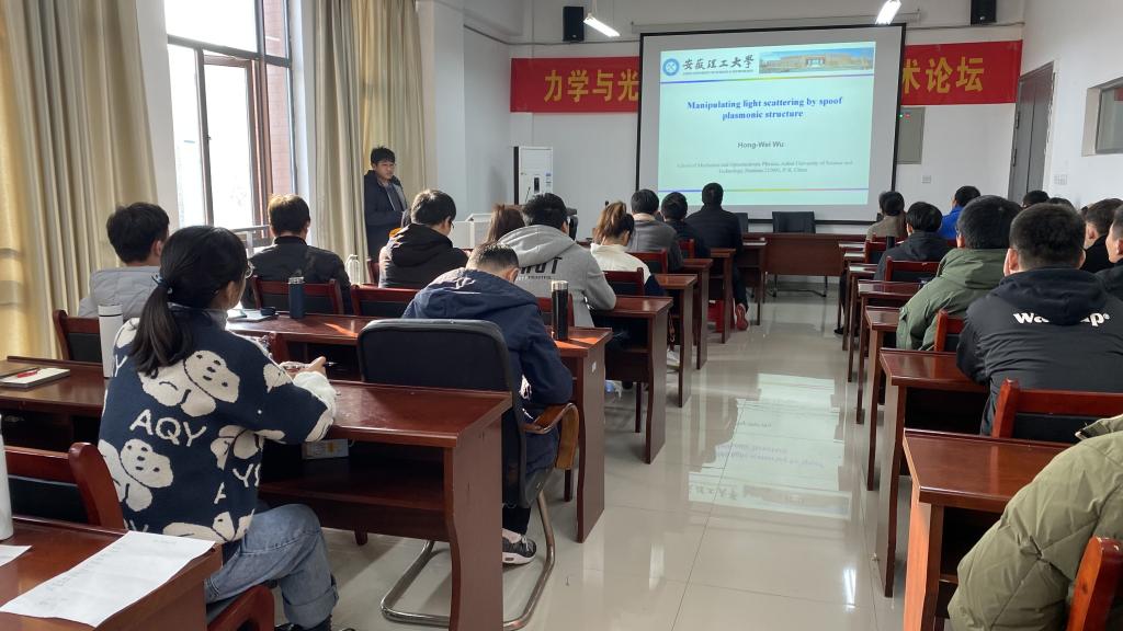 光电物理系吴宏伟副教授在院报告厅为全院光电专业研究生做了题为《基于人工微结构的散射场操控》的学术报告。全体研究生及青年教师100余人参加了报告会。