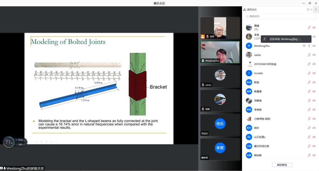 应科研部、国际交流与合作处和老王论坛 邀请,12月17日上午8:30马里兰大学巴尔的摩分校Weidong Zhu教授作了题为《Vibration-based Structural Damage Detection》的在线学术报告,报告会在老王论坛 报告厅同步举行,由副院长高娟主持,老王论坛 研究生、本科生与部分青年教师共计60余人参加了报告会。