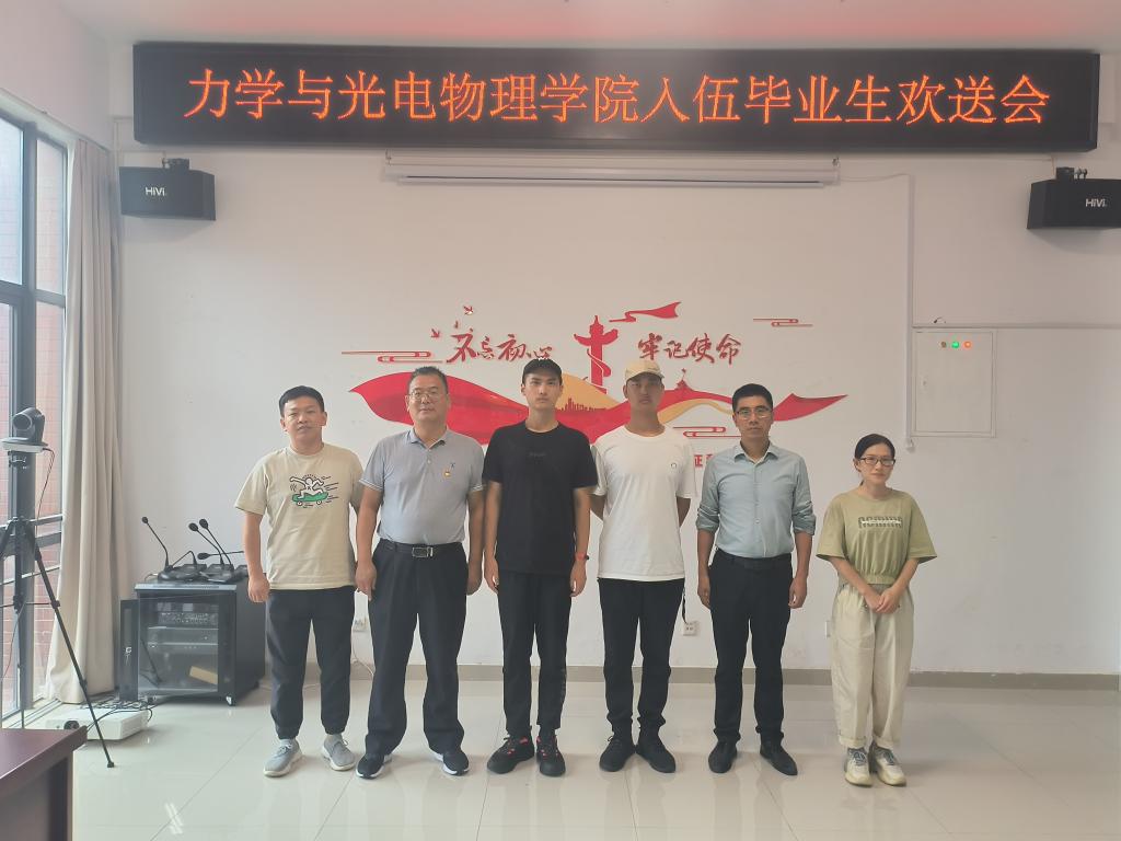 向入伍学生送上关怀和慰问金。参会人员共同合影留念。