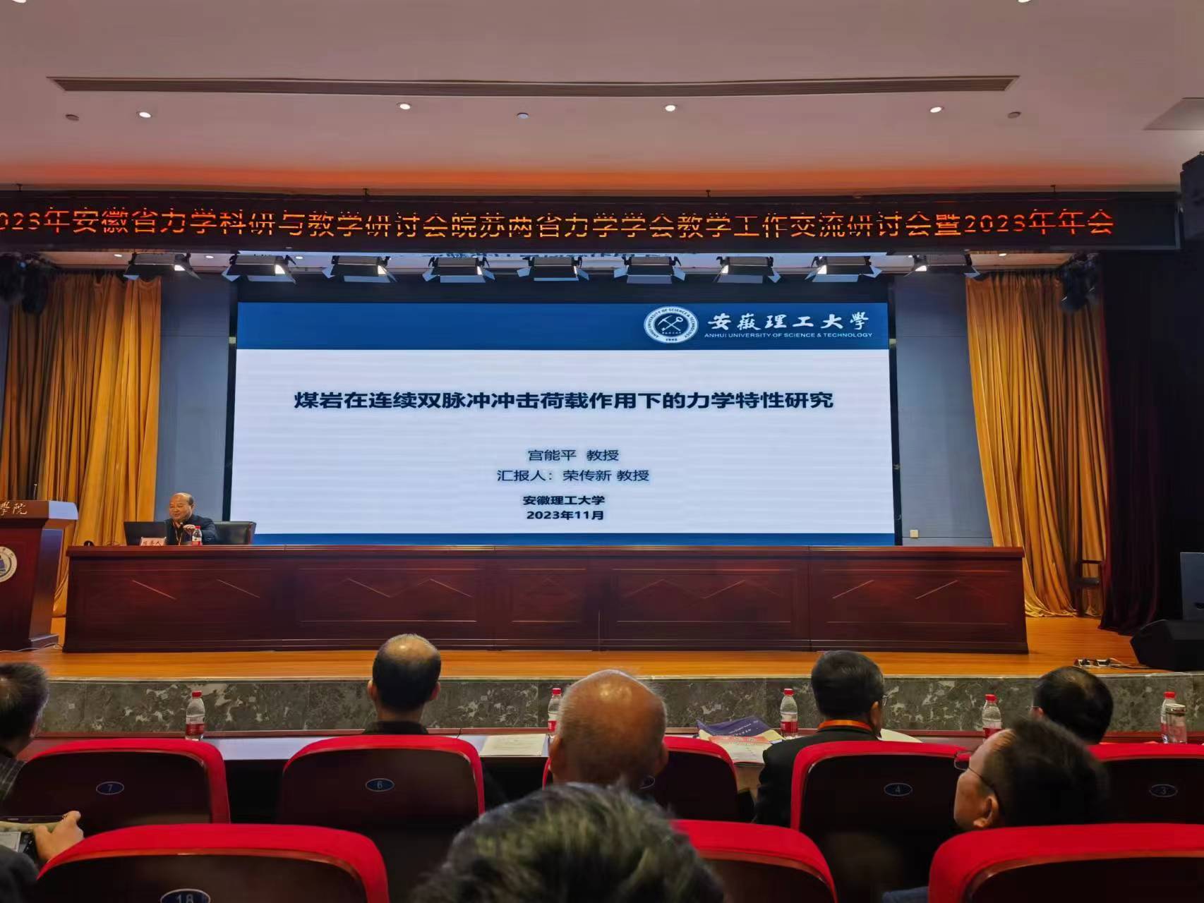 院长荣传新教授代表校党委常委、副校长宫能平作了题为“连续双脉冲冲击载荷作用下的煤岩力学特性及损伤特性研究”的主旨报告。卢小雨与安徽工程大学葛仁余教授为安徽省第一分会场共同主持人。