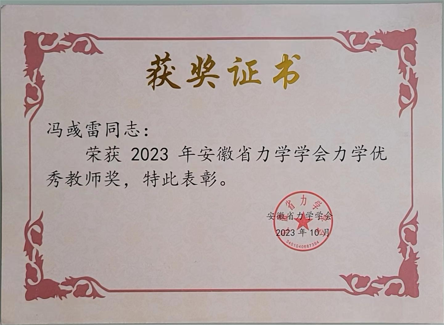 冯彧雷荣获2023年安徽省力学学会优秀教师奖
