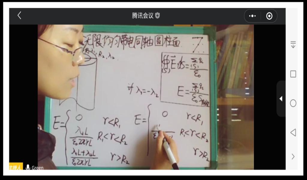 周老师以《大学物理》课程中的“无限长均匀带电圆柱面电场强度”及“两个无限均匀带电圆柱面电场强度”为讲授内容,举例详细讲解了高斯定理的应用。她采用启发式讲授、问题式探讨等方法进行教学。